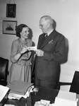 Miss Aldene Kaufman is issuing a sorority banquet invitation to W. D. Smith. The banquet will be held on Thursday February 13 to celebrate the organization's thirteenth anniversary. Miss Kaufman is a member of the Delta Rho Delta Sorority. She is wearing a hat, button-up blouse, and a skirt. Mr. Smith is an attorney in Fort Worth, Texas and a patron of the sorority. He is dressed in a three-piece suit.