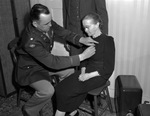 Mrs. Mandy J. Lyons is being presented with the second Purple Heart earned by her son, Private First Class R. D. Lyons before his death in Luzon. Making the presentation is Lieutenant Colonel William H. Nelson, of the Army Recruiting Service in Fort Worth, Texas. The ceremony is being held in Mrs. Lyons' home in Weatherford, Texas. Mrs. Lyons is wearing a dark dress. Colonel Nelson is dressed in his military uniform.