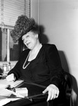 Ruby Alcorn is an employee at the Fort Worth Star-Telegram in the classified ad department. She is shown sitting at her desk, reading through a file. She is wearing an elaborate hat, necklace, and a button-up blouse.