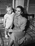 Mrs. J. O. Terrell Couch is posing with her young son, J. O. Terrell Couch Junior "Jot". They recently moved to Fort Worth, Texas from San Antonio, Texas. Mrs. Couch was recently honored with a tea, hosted by Mrs. Hal S. Lattimore at the Fort Worth Club. Mrs. Couch is wearing a button-up blouse and a skirt. Jot is standing on the couch, dressed in a button-up shirt and shorts.