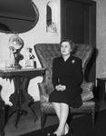 Mrs. Opal Thompson is president of the Cadmean Club. She has been a member of the club for sixteen years and is serving her second term as president. Mrs. Thompson is the former Miss Opal Williams of Vernon, Texas. She is married to F. G. Thompson, a insurance businessman. Their daughter, Mary Paige, is a senior at the University of Texas. Mrs. Thompson is shown sitting on a wing-back chair, wearing a dark dress and a brooch.