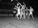 The Texas Christian University Horned Frogs (white jerseys) are hosting the visiting Rice University Owls at Will Rogers Memorial Coliseum. Rice defender Jon McDonald (21) is stretching to block the shot from Frog Bob Young (39). Other players under the basket are Owl Hiram Walker (24) and Frog Frank Kudlaty (22). In a huge upset, the Frogs went on to win the game 55-50. The win broke an 18-game losing streak.