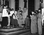 Boys Scouts receiving awards at Fort Worth Saint Patrick's Cathedral. Monsignor O'Donohoe is presenting an award to Alfred Becan while Reverend A. Merkel looks on.