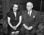 Mr. and Mrs. Gouley Burcham of Los Angeles, California are visiting Fort Worth, Texas for the first time since 1940. The couple made frequent trips to visit old friends, but were interrupted by the war. Mr. Burcham was born in Paris, Texas. He works as a food broker in California. He is dressed in a three-piece suit. Mrs. Burcham is wearing a dark, beaded dress. The couple is shown sitting on a couch at the Fort Worth Club.