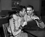 The Texas Wesleyan College (T. W. C.) basketball team is preparing for an upcoming game against Abilene Christian College. The winner of the match-up will takeover first place in the Texas Conference. Two of the Rams' top scorers left to right, are Clifton McNeeley and E. F. Parham. They are shown "punching out" the number of buckets they hope to get against Abilene on an adding machine. Together McNeeley and Parham average 36 points per game. They are both dressed in warm-up suits.