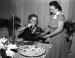 Mrs. Fanny Kerr, left, is pouring tea for Mrs. Ester Baldwin at the Clarice Stovall Tearoom. The event is an Eastern Star tea, held in Mrs. Baldwin's honor. Mrs. Baldwin, of Wichita Falls, Texas, is grand conductress of the Grand Texas Chapter of the Eastern Star. She is wearing a dress and corsage. Mrs. Kerr is the vice president of the Fort Worth Conductress Club. She is wearing a dark dress.