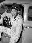 C. F. Dunagan is a Bert & Steve taxi driver in Fort Worth, Texas. On Monday morning, he picked up a fare on the North Side - Mrs. Solia H. Saucedo. They were on the way to the hospital when Mrs. Saucedo delivered a six-pound baby girl. Mr. Dunagan sped the rest of the way to the hospital, safely delivering the twenty-eight year old mother and newborn Mary Ellen. Mr. Dunagan is pictured inside his taxi, dressed in a peaked cap, button-up shirt, and trousers.