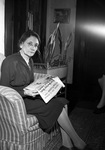 Doctor Helene E. Kenney recently returned home to Fort Worth, Texas. She spent seven months in England visiting her daughter. Dr. Kenney is reading a newspaper article in the Fort Worth Star-Telegram regarding fuel shortage in England. She is hoping for a solution to the misery experienced overseas. Dr. Kenney is shown sitting on a striped chair. She is wearing a dress with lace around the collar.