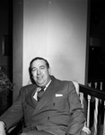Kenneth H. Campbell, of Washington D. C., is a United States Chamber of Commerce official. Mr. Campbell is in Fort Worth, Texas to speak at a luncheon for the newly organized foreign commerce committee. The committee is part of the Fort Worth Chamber of Commerce. The luncheon is being held at the Worth Hotel. Mr. Campbell spoke om the importance of foreign trade. He is shown sitting on a chair, dressed in a double breasted suit.