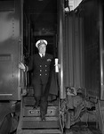Lieutenant Commander J. D. Jones Junior is a member of the United States Naval Reserves. He is disembarking a train after returning from reserves training. His first postwar training took him on the USS Macon. The ship traveled from New Orleans, Louisiana to Panama where the men were granted three days shore leave. From there the ship traveled to Guantanamo Bay, Cuba for gunnery exercises. Commander Jones is dressed in his military uniform.