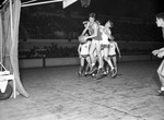 A high school basketball game is being held Monday night at the Will Rogers Memorial Coliseum. Competing are the Arlington Heights Yellow Jackets and the Technical Bulldogs. Bob Thomas (12) of Arlington Heights is jumping into the air and attempting to flip a pass to his open teammate. Bulldog, Bobby McKee (6) is closely guarding Thomas. The Yellow Jackets went on to win the game 41-21.