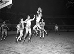 The Texas Wesleyan College Rams (white jerseys) are hosting the visiting Abilene Christian College Wildcats. The winner of the match-up will takeover first place in the Texas Conference. Leaping high into the air for a loose ball in the first half are Ram Clifton McNeeley and Wildcat J. E. Smith. Ram, E. F. Parham (10) is standing nearby. Others pictured for the Wildcats are Guerdon Busby (13) and Chuck Youree (32). The Rams went on to win the tough contest 63-49