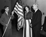 The Polytechnic International Order of Odd Fellows (I. O. O. F.) is receiving a new postwar flag. It was made from the first shipment of silk since before the start of the war. Presenting the flag, left to right, are Julius Wenzil, Mrs. Lena Canada, and J. E. Dalton. Mr. Wenzil is dressed in a pinstripe suit. Mrs. Canada is the noble grand of the Polytechnic Lodge of Rebekahs 316. She is wearing a button-up blouse and a striped skirt. Mr. Dalton is the noble grand of the I. O. O. F. He is dressed in a dark suit.