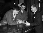 Golden Gloves boxers Tom Adams, Brownfield, Texas (left) and J. D. Kirkpatrick, Peterburg, Texas, registering at a hotel. Jimmy Hankins is the hotel clerk.
