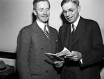 Doctor James Bryant Conant (right) is president of Harvard University. He is visiting Fort Worth, Texas to speak at Texas Christian University (T. C. U.). He is promoting the development of education among youths. He is shown discussing his speech with an unidentified man. Dr. Conant is dressed in a three-piece suit.