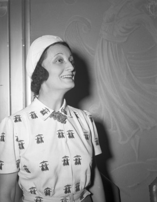 Margaret Hall is a member of the Toastmasters Club. She is standing in front of a wall, wearing her hair in a wrap and a collared dress. The pattern on the dress depicts two silhouettes standing under and umbrella. The back wall features the design of a dancing ballerina.