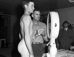 Golden Gloves boxer Jerome Becker, Temple, watches Warren Connelly check Mr. Becker's weight.