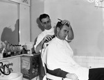 Golden Gloves boxer George Young, Big Spring, Texas, having his hair cut by Barber Brown.