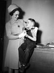 Seven year-old Pat Callahan is asking his foster mother, Mrs. Walter Wilson to be his Valentine. Pat met Mrs. Wilson Thursday at the Family Service Association office. He will be living with her while his mother, who is almost blind, receives treatment in Austin, Texas. Pat is dressed in a collared shirt and overalls. Mrs. Wilson is wearing a hat, collared dress, and a brooch.