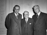 Fort Worth, Texas is hosting a railway directorate. Officials in attendance, left to right, are W. G. Vollmer, R. E. Harding, and P. J. Neff. Mr. Vollmer, of Dallas, Texas, is president of the organization. He is dressed in a three-piece suit. Mr. Harding is president of Fort Worth National Bank and a director of the Texas and Pacific Railway Company (T&P). He is wearing a three-piece suit. Mr. Neff of St. Louis, Missouri, is president of the Missouri Pacific Railroad and a T&P director. He is dressed in a double breasted suit.