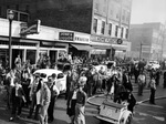 Firefighters fought a blaze in downtown Fort Worth, Texas, for two hours Friday afternoon. The fire spread through the 1300 block on Houston Street. It began when an unidentified worker dropped a flaming match box in a furniture store. A large crowd of people are shown gathering on the streets, watching the fire. The stores in the background include Elliston Radio and Refrigerator Service, Jones Liquor, B. B. S. Store, and Home Furniture.