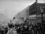 Firefighters fought a blaze in downtown Fort Worth, Texas, for two hours Friday afternoon. The fire spread through the 1300 block on Houston Street. It began when an unidentified worker dropped a flaming match box in a furniture store. A large crowd of people are shown gathering on the streets, watching the fire. The stores in the background include Hotel Gimbell, Naylor Hotel and the Henderson Furniture Exchange.