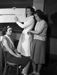 Paschal High School home nursing class taught by Harris College of Nursing. Mary Ann Wilson, seated, is having her temperature taken by Carolyn Cox (right). The instructor is Miss Edith Prather.