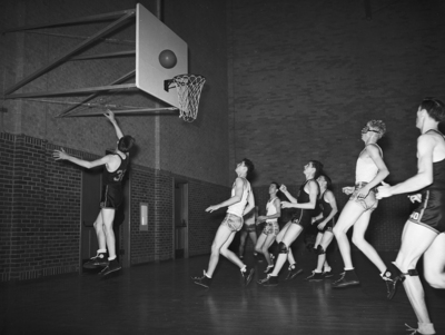 Image shows Polytechnic High School took on the Arlington Heights basketball team at home in the Parrot's gym. Eight unidentified players are shown during basketball game. The basket gave Poly a quick 2-0 lead and they never looked back, beating Arlington Heights 33-8. Published in the Fort Worth Star-Telegram morning edition January 10, 1940.