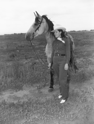 Fern Sawyer and her favorite horse, "Tony." She is holding on the reins, standing next to the horse in the field. Her popularity as a cowgirl has grown and she performs in many Southwest rodeos. She is the daughter of Mr. and Mrs. U. D. Sawyer, ranch people of Crossroads, New Mexico. She is wearing a blouse, trousers, cowgirl hat and cowgirl boots.