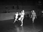 The Fort Worth South Side Rockets and the Parker Tigers are facing off in a twelve-year-old basketball game at Paschal High School. Don Cumby, the barefoot rocket, is racing down the court, preparing to fire a basket. Several defenders are in pursuit. The Rockets went on to defeat the Tigers 32-5.