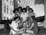 Miss Peggy Gallagher of Texas Wesleyan College, refers to rule at case clinic. In clockwise order around her starting at lower left, are Pauline Cumings, Mount Carmel High School; Anita Jones, Arlington Heights High School; Rosie Phillips Technical High School; Dorothy Barton, Diamond Hill High School; Ramona Harris, Amon Carter Riverside High School and Patricia Tucker, Paschal High School.