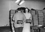 Tarrant County employees are illustrating the new 1947 license plates. Posing with the front and rear plates, left to right, are F. N. Menefee and Mrs. Jimmye Cantrell. Tarrant County, Texas, received 98,000 pairs of license plates to go on sale February 1, 1947. Numbers are white on a black background. Mr. Menefee is dressed in a houndstooth sports coat and trousers. Mrs. Cantrell is wearing a button-up blouse and a skirt. Boxes are stacked in the background. Mr. Menefee has his back to the camera.