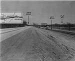 Highway U.S. 80 (Dallas Pike) between Fort Worth and Arlington near Handley showing new road and cars driving on the old road parallel to Texas & Pacific train track with train coming down track.