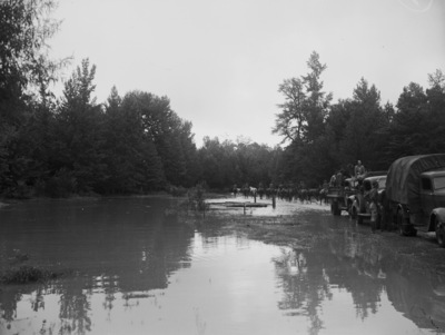Texas National Guard maneuvers in Louisiana. Under that moisture yonder is Louisiana. This watery route down which part of the cavalry moves in the background is what the Texas National Guard found upon arrival Sunday for Third Army Maneuvers. After a one-day drouth, however, things dried up to where the boys could fight in comfort.