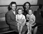 Twins sisters Mrs. Paul Rawdon (left) and Mrs. L. R. Crawford have been granted adoption of two orphaned sisters. Mrs. Rawdon is holding her daughter, Linda Kay Rawdon, and Mrs. Crawford is holding her daughter, Donna Jean Crawford. Mrs. Rawdon is dressed in a collared blouse, blazer, and a skirt. Linda Kay is wearing a collared blouse and a plaid skirt with suspenders. Mrs. Crawford is wearing a dark dress. Donna Jean is wearing a striped, button-up dress.