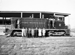 Fort Worth Belt Line Railway diesel locomotive. Standing alongside, left to right, E. M. Justus, W. L. Pier, A. G. Donovan, A. L. Lund, Dave Barron, O. E. Kent, Scott McConnell. On locomotive, left to right, A. F. Riedel, R. J. Lockett, C. C. Null, R. H. England and S. R. Brookshier (in cab).