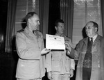 J. M. North Junior (right) receiving a Bureau of Naval Personnel certificate of achievement for his service in World War II from Commander W. T. Zink, Dallas, Texas, left, and Lieutenant Commander Ronald Wheeler, center. This photograph was published in the "Star-Telegram Junior" a newspaper published for employees of the Fort Worth Star-Telegram.