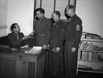 National Guard "pay day." Captain T. C. Cole, seated, handing checks to (from left) Master Sergeant Charles A. Austin, Staff Sergeant Clyde C. Witherspoon and 1st Sergeant Leaonard H. Iwan.