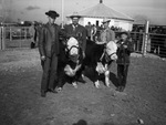 Wichita Falls District Show, Hereford steer champion and reserve champion. At left is Ray Sims with champion. Center is F. W. Martin, county agent. At right is reserve champion steer with Jerry Terrell (at halter) and his brother Edwin Terrell.