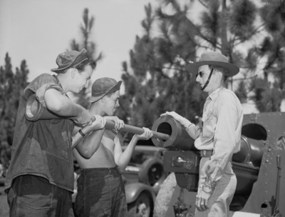 Texas National Guard maneuvers in Louisiana. Candid Camera Snapshots of Texas National Guardsmen on Maneuvers. This must be done after every round is fired from these 155-mm howitzers. It is called "swabbing out." Performing the operation on one of the guns of Battery B, One Hundred Thirty-third Field Artillery, a Fort Worth unit, are Privates J. H. Potter, left, and James C. Smith. Caressing the muzzle of the piece is Second Lieutenant Richard B. Boyle Junior, Second Lieutenant Boyle is a Fort Worth, Texas officer.