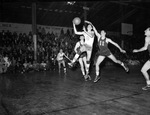 A bi-district high school basketball game is being held at the Texas Christian University Field House. The winner of the game will receive a spot in the state tournament. Competing in the Dallas versus Fort Worth game are the Crozier Technical Wolves and the Paschal Panthers (white jerseys). In the first quarter of the game Bryan Kilpatrick (8), Panther forward is shown leaving his feet for a layup. Jack Brown (11) and Lawrence Young (10) are attempting to block the shot for the Wolves. The Wolves went on to win the game 39-36.