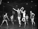 A bi-district high school basketball game is being held at the Texas Christian University Field House. The winner of the game will receive a spot in the state tournament. Competing in the Dallas versus Fort Worth game are the Crozier Technical Wolves and the Paschal Panthers (white jerseys). In the first quarter of the game Panther O. A. Ryfle (16) attempted to pass the ball to teammate Eldon Conrad (4). As Ryfle released the ball, Crozier's Joe McDaniel (2) reached out and deflected the pass. Also pictured are Ernie Vossler (15) for the Panthers and Jack Brown (11) and Lawrence Young (10) for the Wolves. The Wolves went on to win the game 39-36.