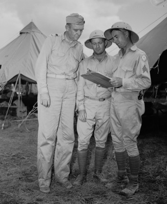 Texas National Guard maneuvers in Louisiana. Candid camera snapshots of Texas National Guardsmen on Maneuvers. Every man must be in his proper tent and tent rosters kept accordingly. Here, First Lieutenant D. D. Duncan, First Sergeant J. R. Adams and Sergeant J. E. Ferguson of Company K, One Hundred Forty-second Infantry, from Stamford, are checking the roster of their company, whose tents are pitched to the rear.