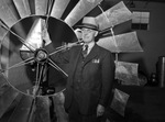 Sam Vaughn, head of Sam Vaughn Aermotor Company, standing beside an Aermotor windmill.