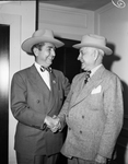 Stock Show. Parade, etc. Tom Clark, left, and Amon Carter. The men are standing in a room in front of an open door, They are dressed in suits and tie, inner collared shirts, and hats. Mr. Clark is wearing a bow tie while Mr. Carter is wearing a straight tie. They are shaking each others hands. Mr. Clark is looking at the camera while Mr. Carter is looking sideways at Mr. Clark.