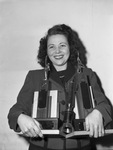 Ann Butler holding trophies to be awarded champions and runners-up in the Southwest Area "Y" volleyball tournament.