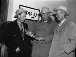 "Stamford Day" at the Southwestern Exhibition and Stock show visitors (from left) John Selman, S. M. S. Ranch foreman, W. G. (Bill) Swenson, President of the Texas Cowboy Reunion.. Louie Hardy, Vice President of the Reunion. Inset shows Miss Bette Smith, Stamford's Queen.