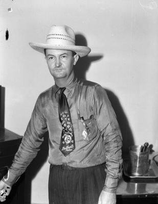 Dalhart. XIT Reunion. Cecil Johnson, seen standing against a wall in cowboy clothing.