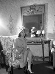 Miss Janine Ponder modeling a Keneth Hopkins flower-adorned Easter bonnet at The Fair Store style show luncheon.