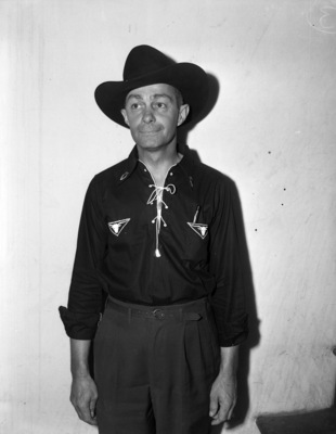 Dalhart. XIT Reunion. Raymond Jacques, is seen standing against a wall in his boy clothing.